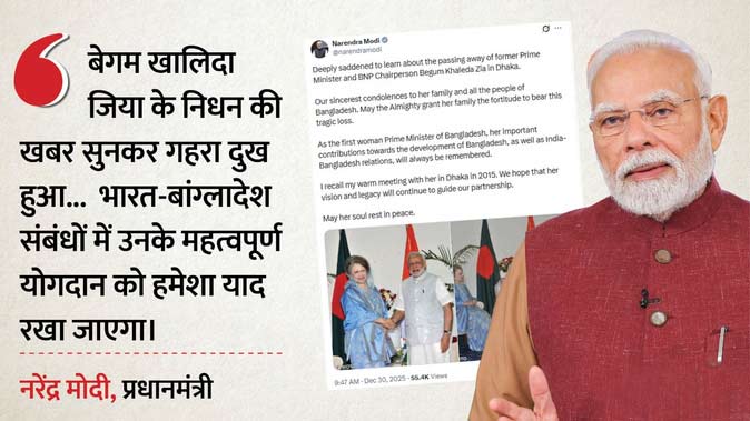 Khaleda Zia Condolences: बांग्लादेश की पूर्व प्रधानमंत्री खालिदा जिया के निधन पर प्रधानमंत्री नरेंद्र मोदी समेत दुनियाभर के कई नेताओं ने शोक प्रकट किया है। पीएम मोदी ने 2015 में खालिदा जिया के साथ हुई मुलाकात की तस्वीर साझा कर द्विपक्षीय संबंधों में उनके योगदान को रेखांकित किया।