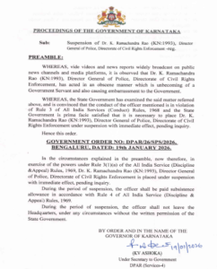 राज्य में मुख्यमंत्री सिद्धारमैया की सरकार ने निलंबन की जो कार्रवाई की है, इसके संबंध में जारी सरकारी आदेश के मुताबिक पुलिस महानिदेशक (डीजीपी) डॉ. के रामचंद्र राव, कर्नाटक पुलिस की नागरिक अधिकार प्रवर्तन शाखा के महानिदेशक का पदभार संभाल रहे थे। राज्य सरकार के इस शीर्ष पुलिस अधिकारी के निलंबन का मामला तूल पकड़ता जा रहा है।